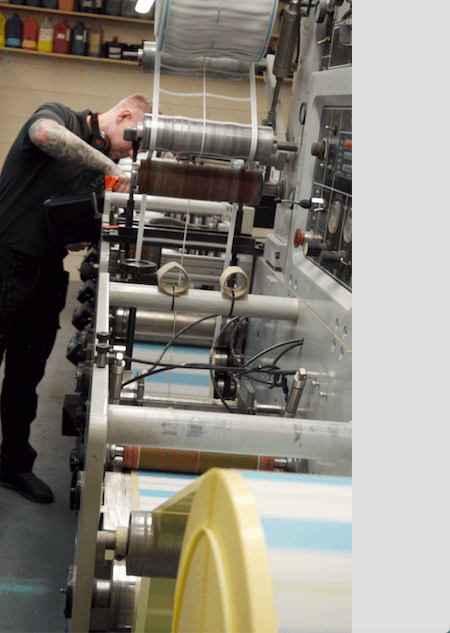 The flexographic printing of labels incurs initial setup and changeover costs. We start by making a printing plate with your design, using that plate to press your design onto a label material.